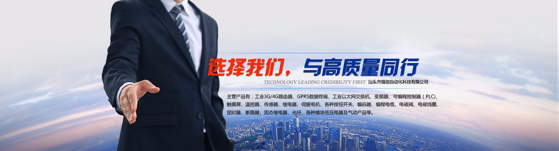 汕頭市福創自動化科技有限公司是一家集自動化元件的代理銷售與維修、自動化設備設計制造、自動化工程安裝改造、機電工程安裝改造、自動化機械設備設計與制造的企業。 主營產品有:工業3G/4G路由器、GPRS數據終端、工業以太網交換機、變頻器、可編程控制器(PLC)、觸摸屏、溫控器、傳感器、繼電器、伺服電機、各種按鈕開關、編碼器、編程電纜、電磁閥、電磁線圈、定時器、斷路器、固態(tài)繼電器、光纖、各種模塊低壓電器及氣動產品等。